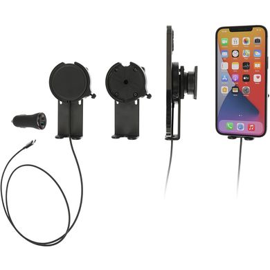 Uchwyt z adapterem CL do ładowania i adapterem do magnetycznego ładowania bezprzewodowego kompatybilny z Apple MagSafe dla telefonów komórkowych Apple 12/13/14/15/16/17/Air. Uchwyt posiada regulowaną wysokość dolnej podpórki dla szybkiego i dokładnego osadzenia telefonu w uchwycie.