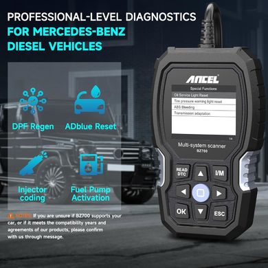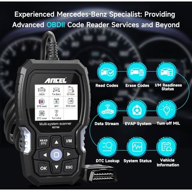 Dzięki pełnej kompatybilności z protokołami komunikacyjnymi OBD-II i EOBD, przyrząd ten jest w stanie przeprowadzić podstawową diagnostykę jednostek sterujących zdecydowanej większości nowoczesnych samochodów osobowych i lekkich pojazdów użytkowych, niezależnie od marki. Dzięki tej funkcji można szybko i łatwo zidentyfikować usterki silnika, sygnalizowane przez kontrolkę „Check Engine“ na tablicy rozdzielczej. Dzięki temuANCEL BZ700 jest kompleksowym rozwiązaniem do diagnozowania niemal każdego możliwego problemu w nowoczesnych pojazdach . Z jego pomocą można wykrywać i usuwać usterki, zanim przerodzą się one w poważniejsze i bardziej kosztowne awarie. Dzięki temu przyrząd ten staje się nieocenionym narzędziem dla każdego profesjonalnego mechanika i bardziej wymagającego użytkownika amatora w zapewnieniu niezawodnej i bezproblemowej eksploatacji pojazdów Mercedes-Benz i innych.