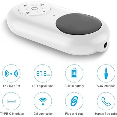 Bezprzewodowy adapter audio 3w1 Mobilly – tryb nadajnika TX, tryb odbiornika RX, tryb nadajnika FM (87,5–107,9 MHz)