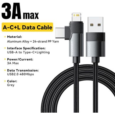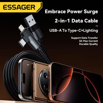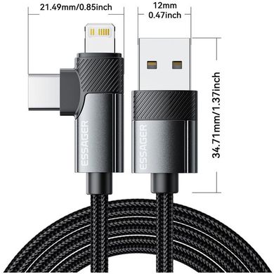 Uniwersalny kabel do ładowania Essager William 2 w 1 z USB-A na Type-C/Lightning, złączami pod kątem 90°, prądem 3A, długością 2m i 24-warstwowym oplotem.
