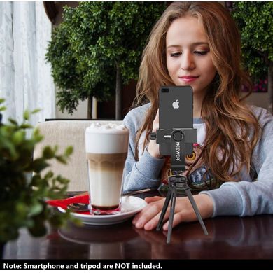 Prosty uchwyt na telefon. Utwardzony plastik i wewnętrzne metalowe koła zębate zapewniają pewne trzymanie telefonu w uchwycie. Dzięki uniwersalnemu gwintowi statywowemu nie musisz się martwić, że nie przymocujesz uchwytu do gimbala, statywu lub tyczki teleskopowej.