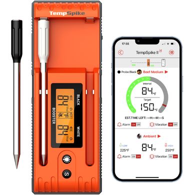 Te wstępnie ustawione temperatury zostały zaprojektowane, aby pomóc w przygotowaniu pysznych posiłków. Ponadto w aplikacji można ustawić temperaturę otoczenia i alarmy wstępnego gotowania. Alarmy te są wyzwalane, gdy temperatura mieści się w zakresie 3°C / 6°C / 9°C od temperatury zadanej. Następnie smartfon przypomni o konieczności uniknięcia przypalenia lub rozgotowania potrawy, zapewniając doskonały rezultat za każdym razem. Podstawa TempSpike TP-962 działa również jako wzmacniacz sygnału dla termometru z sondą bezprzewodową. Ponadto zapewnia wskaźnik niskiego poziomu naładowania baterii. Żywotność baterii sondy może wynosić do 36 godzin na pełnym naładowaniu. Bezprzewodowe sondy TP-962 są wykonane ze stali nierdzewnej o stopniu ochrony **IP67, co ułatwia ich czyszczenie.