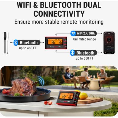 Dzięki wstępnie ustawionym przepisom za każdym razem uzyskasz doskonałe rezultaty, a konfigurowalne alarmy zapewnią, że niczego nie przegapisz. Monitorowanie w czasie rzeczywistym zapewnia absolutną kontrolę nad całym procesem gotowania od początku do końca. Dwuzakresowe Wi-Fi (2,4 GHz/5 GHz) i technologia bezprzewodowa Bluetooth 5.2 zapewniają stabilne i niezawodne połączenie o doskonałym zasięgu. Sygnał pomiędzy sondą a wzmacniaczem osiąga zasięg do 140 metrów, gdy pokrywa grilla lub wędzarni jest otwarta i 4–12 metrów, gdy pokrywa jest zamknięta. Istnieje zasięg do 180 metrów pomiędzy wzmacniaczem a urządzeniem inteligentnym przez Bluetooth i nieograniczony zasięg przez WiFi, dzięki czemu można swobodnie poruszać się po domu i ogrodzie i nadal mieć oko na swoje kulinarne arcydzieło. Kompaktowe wymiary sondy (średnica 5,4 mm i długość 106 mm) i wzmacniacza (101×64×20 mm) umożliwiają łatwe przechowywanie i przenoszenie. Wytrzymała konstrukcja i wysokiej jakości materiały zapewniają długą żywotność i niezawodność nawet przy intensywnym użytkowaniu.