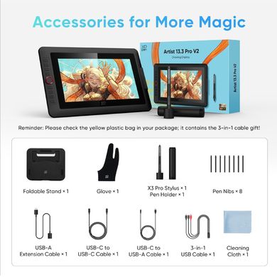 Rozdzielczość warstwy wykrywania 5080 lpi zapewnia niezwykle dokładne przechwytywanie ruchu pióra przy minimalnej ziarnistości, porównywalnej z droższymi profesjonalnymi tabletami graficznymi. Dołączona do zestawu regulowana podstawka AC42 ma wymiary 266,3 × 222,9 mm i zapewnia stabilną podstawę dla tabletów o rozmiarze do 33,78 cm.Konstrukcja podstawki wykorzystuje wytrzymały stop aluminium z antypoślizgowymi silikonowymi podkładkami, aby zapewnić stabilność na różnych powierzchniach i chronić tablet przed zarysowaniami. Mechanizm regulacji kąta nachylenia do 90 stopni wykorzystuje płynne połączenia cierne, które umożliwiają precyzyjne ustawienie kąta pracy i niezawodne utrzymanie go nawet przy intensywnym korzystaniu z rysika. Ulepszona wentylacja zapewnia skuteczne odprowadzanie ciepła, co jest ważne dla utrzymania optymalnej wydajności podczas intensywnego użytkowania, zwłaszcza podczas pracy z wymagającymi aplikacjami, takimi jak renderowanie 3D lub edycja wideo. Oprócz podstawki, w zestawie znajduje się osiem wymiennych końcówek rysika o różnych poziomach twardości, aby dostosować się do różnych stylów rysowania, specjalna rękawica do rysowania z przewodzącymi opuszkami palców do gestów multitouch, elegancki uchwyt na pióro ze zintegrowanym schowkiem na zapasowe końcówki oraz kompletne okablowanie, w tym kabel HDMI 3 w 1 i w pełni funkcjonalny kabel USB-C z obsługą DisplayPort Alt Mode.