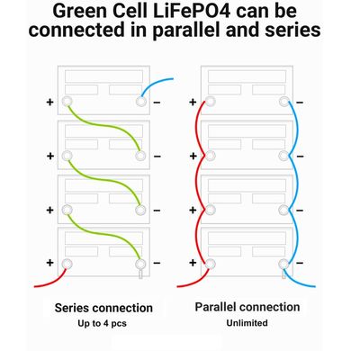 - Możliwość szeregowego połączenia akumulatorów LiFePO4 zapewnia wyższe napięcie przy zachowaniu tej samej