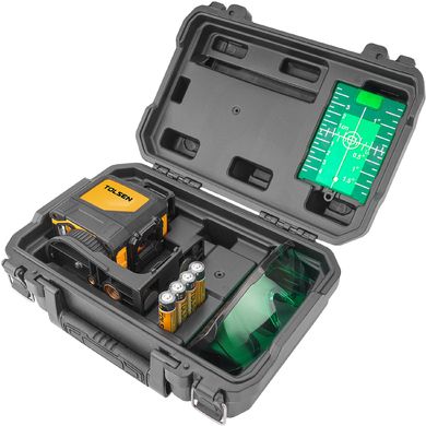 Laser krzyżowy samopoziomujący, laser zielony, zasięg 30 metrów, 2× linie 360°, zasilanie 4 baterie AA, czas pracy do 8 godzin