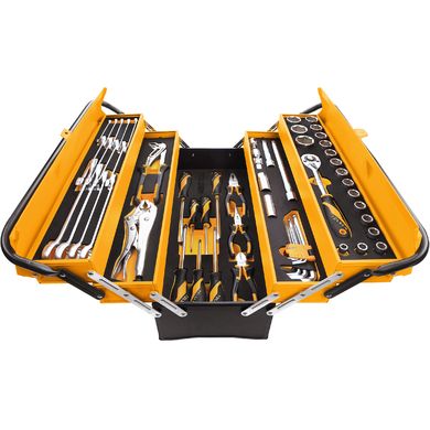 Zestaw zawiera wszystko, czego potrzebujesz – szczypce (kombinowane, samozaciskowe, wąskie, rozłupujące), wkrętaki o różnych rozmiarach (płaskie i krzyżakowe), grzechotkę z nasadkami, klucze nasadowe i nasadowe, klucze do świec zapłonowych, szczotki do łożysk kulkowych i inne akcesoria, w tym przedłużki i nasadki przegubowe. Wszystko jest starannieprzechowywane w poszczególnych przegródkach.