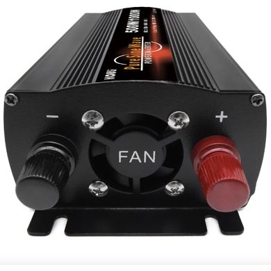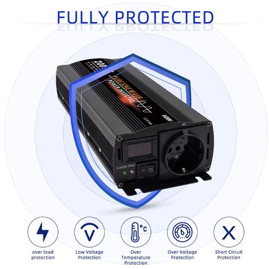 Przetwornica z 12V na 230V, wyjście 1× gniazdo 230V, zasilanie z akumulatora samochodowego, moc 500W, krótkotrwale do 1000W, 1× wentylator, czysta sinusoida, LCD