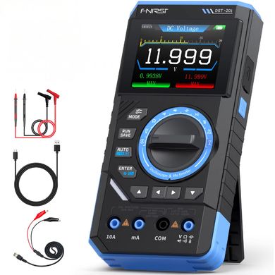 FNIRSI DST-210 (i jego podstawowa wersja, DST-201) to przenośny wielofunkcyjny przyrząd, który łączy w sobie oscyloskop, generator sygnału i w pełni cyfrowy multimetr. Dzięki wydajnemu próbkowaniu, szerokiemu zestawowi funkcji pomiarowych i czytelnemu kolorowemu wyświetlaczowi staje się idealnym narzędziem dla techników, laboratoriów szkolnych i majsterkowiczów. Ponadto DST-210 oferuje wyższą częstotliwość próbkowania i szersze pasmo do szczegółowej analizy przebiegów.